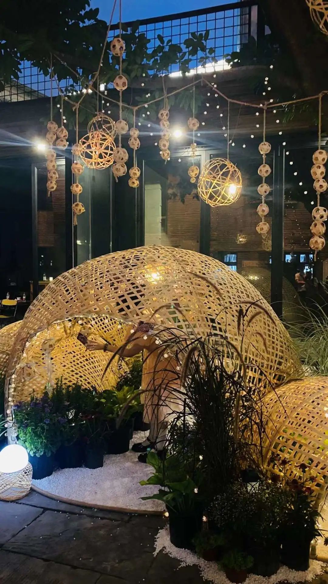 作品“万家灯火”,充分运用竹编、灯光、空间设计,结合悬挂、穿插、组合灯手法,打造出三个模仿重庆立体城市地貌特征的半圆形竹编模型。