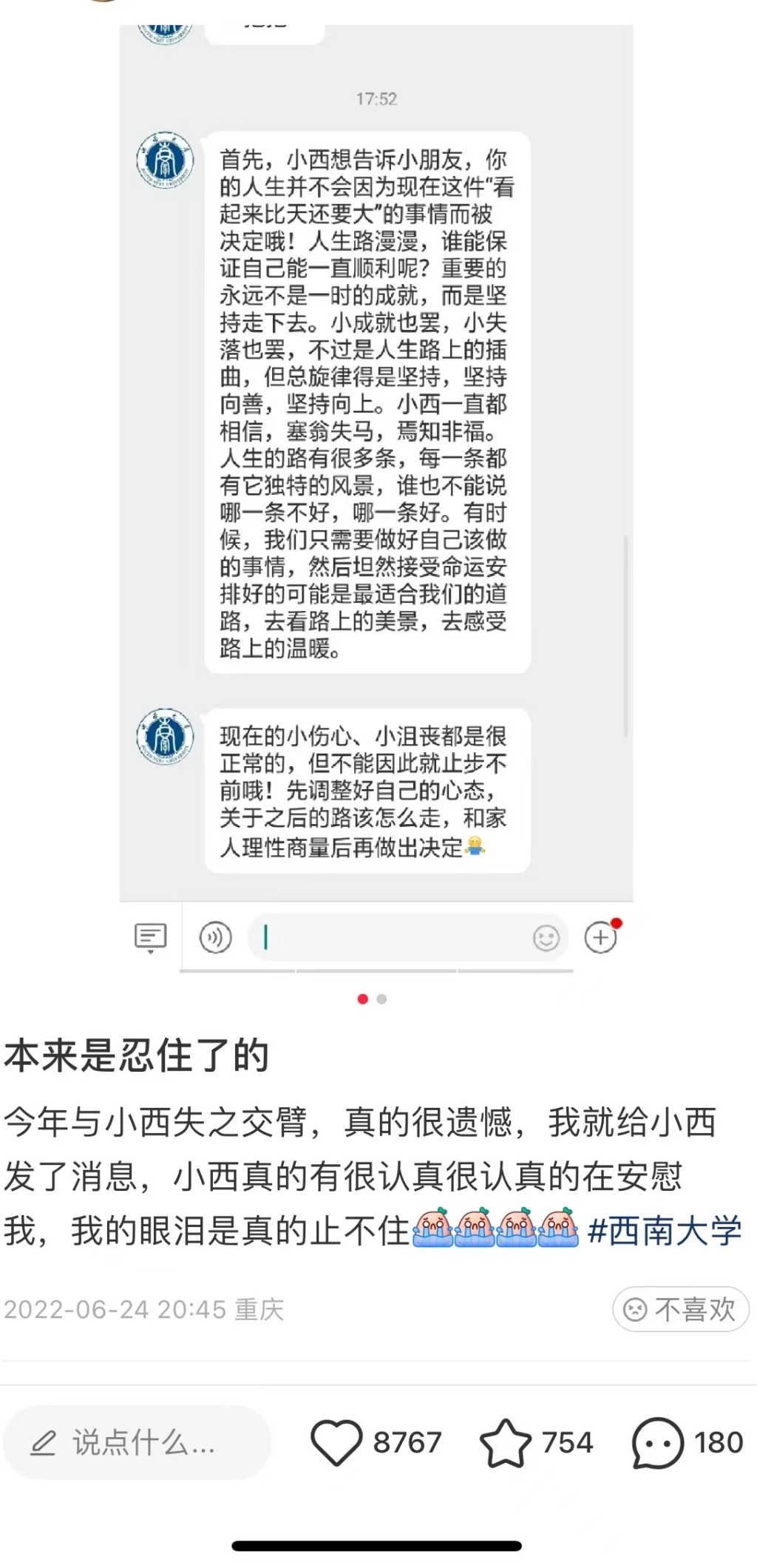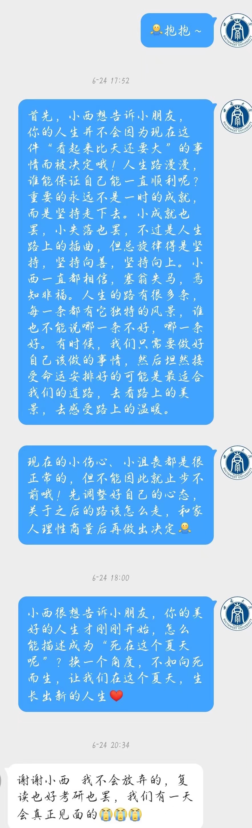 据了解,6月24日重庆公布高考分数,一名考生因高考失利,与其理想大学——betway88西汉姆联失之交臂,当天15点左右,她向betway88西汉姆联官微表达自己的遗憾。“我无数次幻想这里会不会有我的一份,大家考都还不错只有我败下阵来。”“好像一切都搞砸了,我是谁?要去哪儿怎么去?是不是没有未来了?”