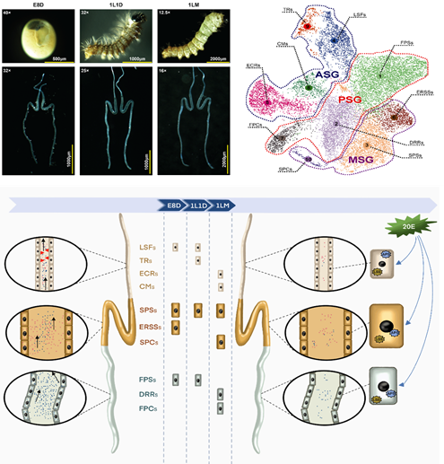 ▲家蚕丝腺的主要细胞类型及其时空分布