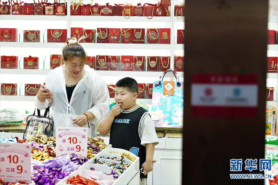 观农贸粮油批发市场,市民试吃糖果。这家商铺正在开展使用“数字人民币农行钱包”支付满减促销活动。新华网 邵以南 摄
