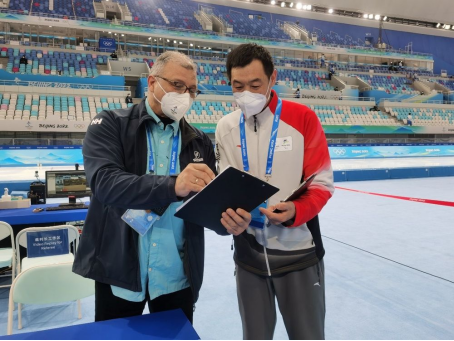 图为程富春(右)与外籍裁判员交流