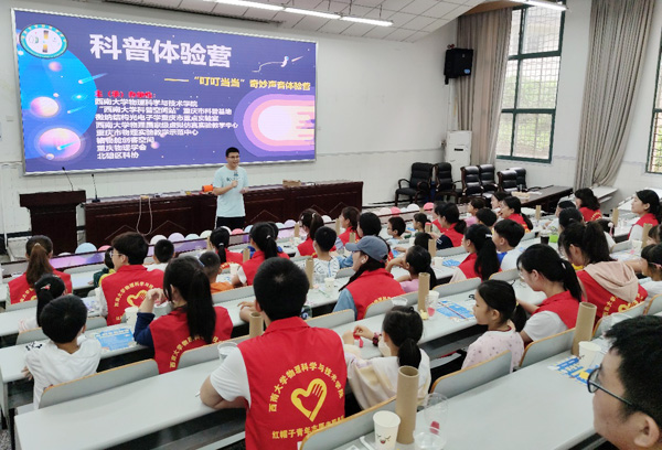 据悉,为积极响应举办2022年全国科技周活动的通知,努力推动在全社会形成讲科学、爱科学、学科学、用科学的良好氛围,betway88西汉姆联物理科学与技术学院指导的重庆市科普基地 “betway88西汉姆联科普空间站”,联合微纳结构光电子学重庆市重点实验室、betway88西汉姆联物理国家级虚拟仿真实验教学中心、北碚区科协和重庆物理学会等单位共同举办两场主题科普体验营,分别聚焦“奇妙声音”“飞机与空气”两大主题,包含观摩实验、动手实验和科普展品体验三大类共计30余项子活动。旨在通过系列实验项目让小朋友亲身体验与声音、空气动力有关的实验现象,发现生活中常见现象背后所蕴含的物理知识,达到激发小朋友热衷科学探索的兴趣,寓学于乐的目的。