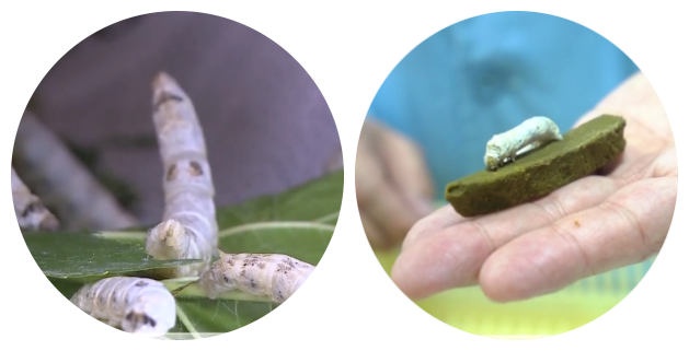 “传统养蚕模式是用桑叶来喂蚕。这种模式就很受季节和条件的限制, 我们通过长时间的研发、生产这种饲料,蚕很爱吃,长得也很壮。”