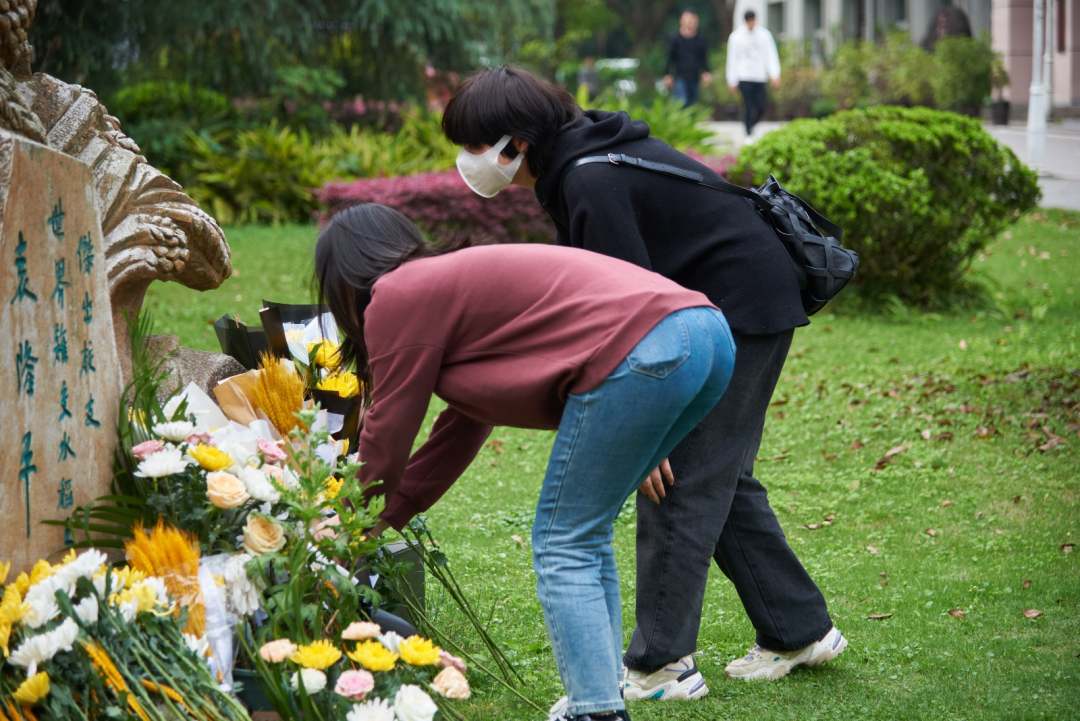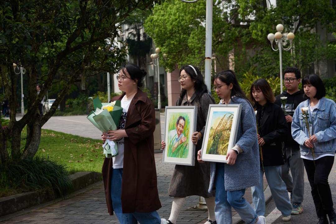 美术学院的学生还通过画像的方式缅怀校友,志愿者们在食堂发起“光盘”行动,分发一些自制的纪念品,鼓励同学们节约粮食。