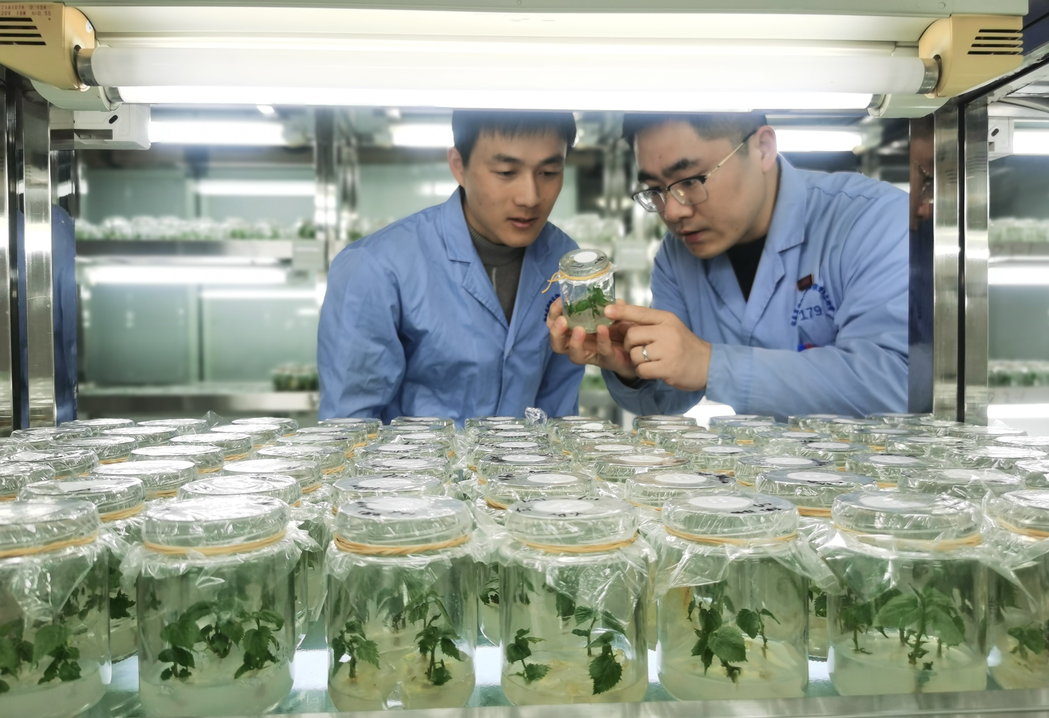 轩亚辉(左)和梁九波(右)在实验室查看培育的桑树苗。科技日报记者雍黎/图