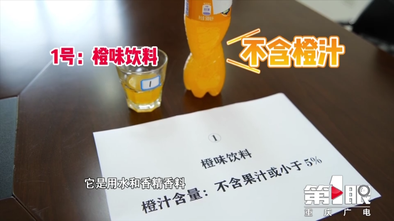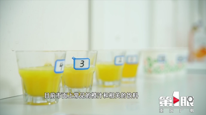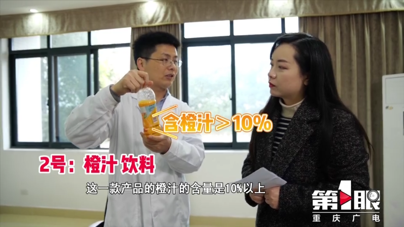 黄博士告诉小草:第1号是橙味汽水,但是它是不含橙汁的,它是用水、香精香料和糖浆兑出来的,橙汁小于5%以下的都叫橙味饮料。第2号是橙汁饮料,它的橙汁含量是10%以上。大家可能没想到,平时爱喝的橙味汽水结果一滴橙汁都没有,而富含果肉的橙汁饮料,橙汁的含量也没有想象中那么多。