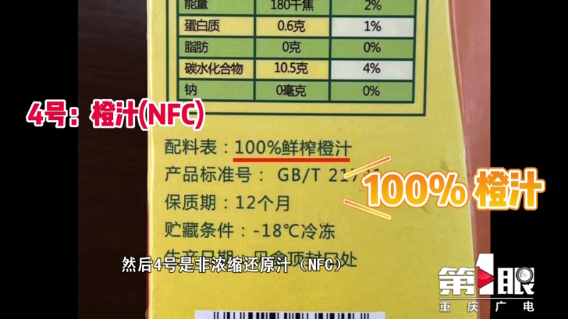3号是100%的浓缩还原橙汁,4号是非浓缩还原橙汁(NFC),它们都是百分之百的橙汁。浓缩还原橙汁,是不是有点儿拗口?!其实说起来也很简单,就是把浓缩橙汁在制作过程中蒸发掉的水份按比例添加回去,配制成100%的橙汁。而非浓缩还原橙汁,也叫NFC橙汁,它是橙子压榨之后直接杀菌灌装的,没有经过浓缩还原的过程,所以更好地保留了橙汁的营养和风味,特别是香气!