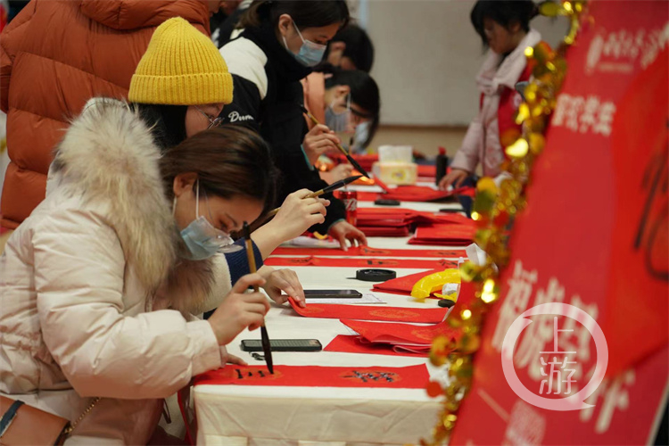 在“福虎呈祥”活动现场,大家将心中祈愿化为一个个福字、一副副春联,端端正正、浓笔重墨写在红纸上,寄托新年愿景。