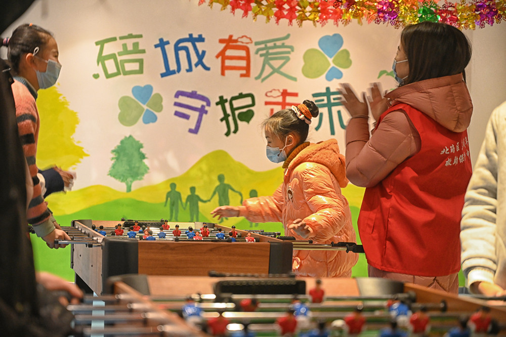 ▲1月25日,北碚区未成年人保护中心,孩子们在志愿者的陪伴下玩游戏。