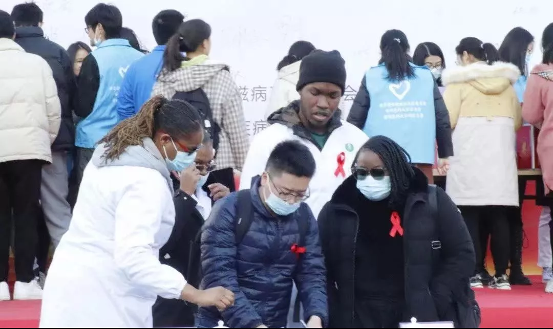 图为安徽医科大学组织留学生参与防艾活动