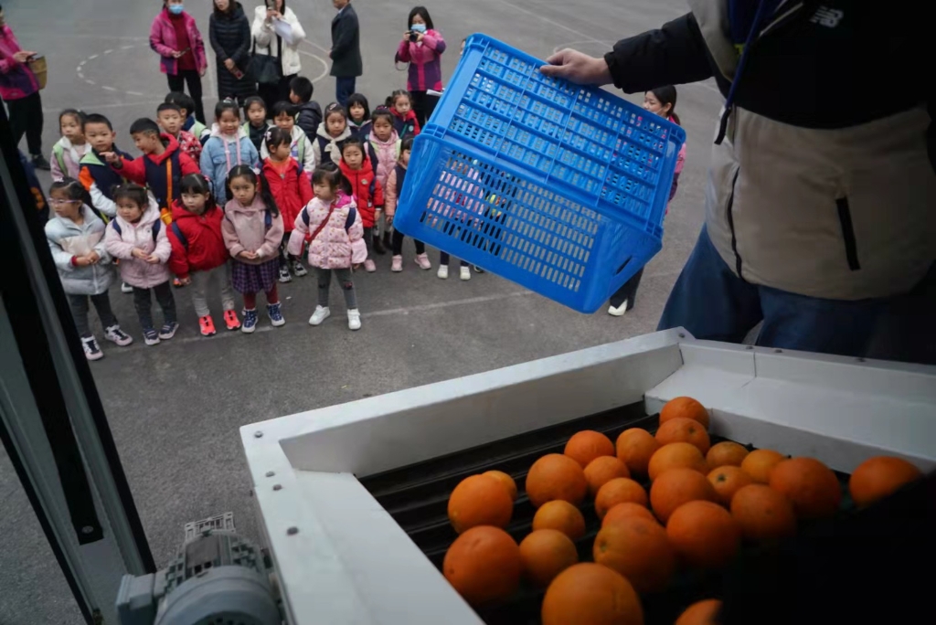 现场,数十位小朋友站在柑橘品质流动检测分级车前,听到专家叔叔讲解这辆大卡车是如何将柑橘分拣出大小,送到千家万户手中去,不少萌娃看到传送带上的柑橘,急得直呼“橙子加油跑,橙子加油跑”,还有不少小朋友用小手轻轻捧起了挂在枝头的柑橘,一脸天真无邪......原本沉静的研究所里回荡着幼儿们的欢声笑语,好不热闹。