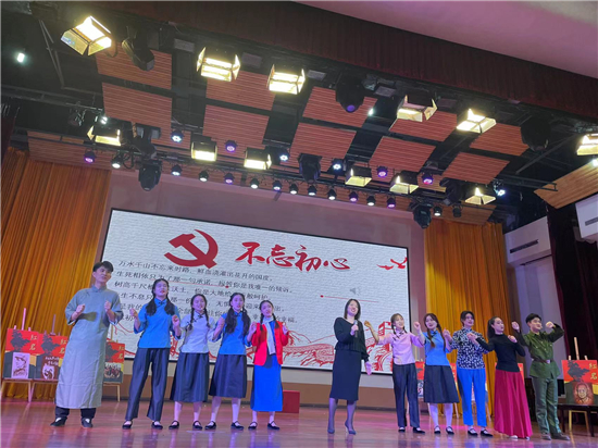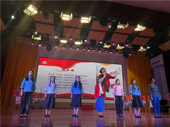 主讲人音乐学院葛爱新老师讲述了红色经典歌曲《绣红旗》,音院学子表演情景歌剧还原了江姐带领狱友憧憬革命胜利,制作五星红旗的场景。优美动人的旋律中,现场师生身临其境地感受到了革命先烈对信念的无限忠诚。葛老师带领大家一起学习“红岩精神”的内涵和时代意义,并号召在场的新生们积极思考在新时代如何秀出“新天地”。最后,葛老师带领全体师生齐唱歌曲《不忘初心》,用歌声表达对英烈的慰藉和对未来的憧憬。