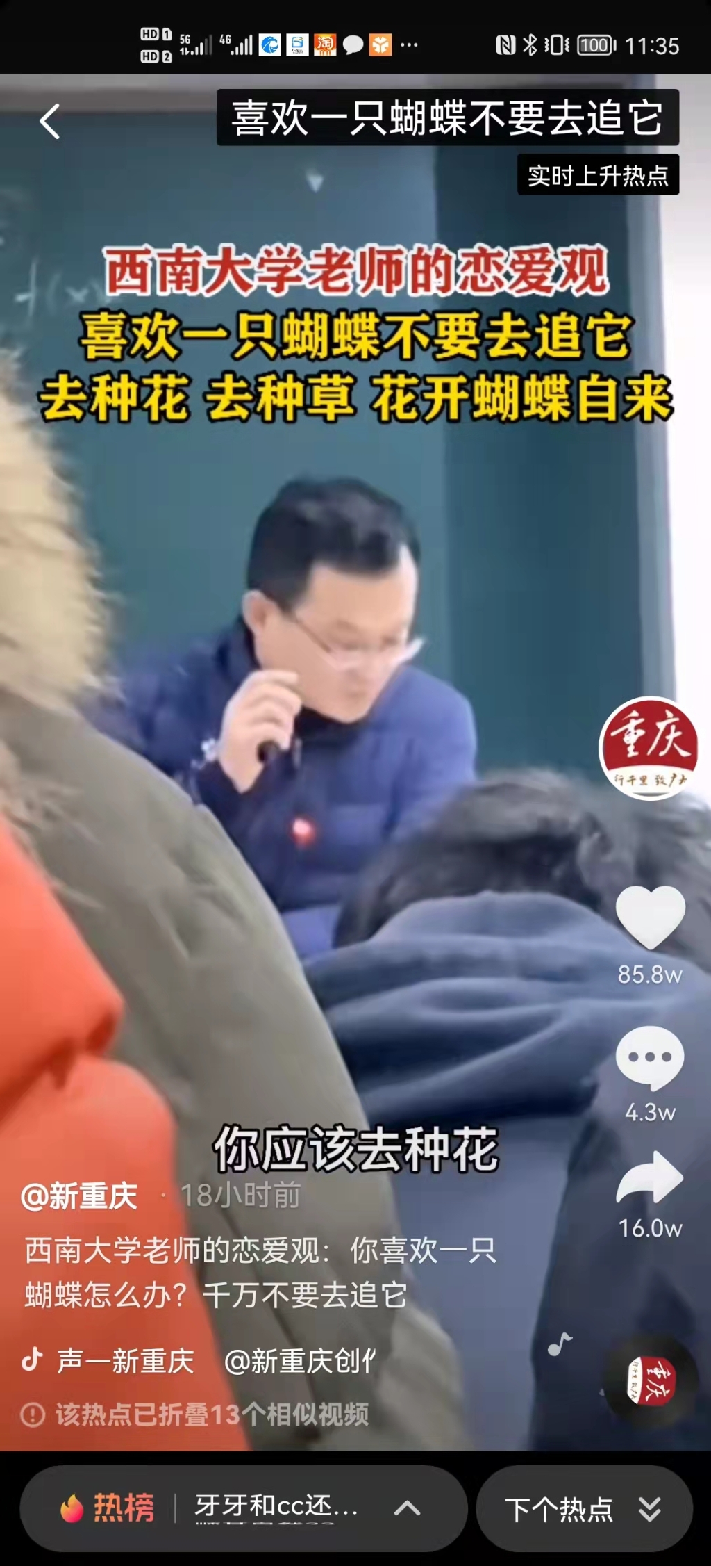 “你喜欢一只蝴蝶,千万不要去追它,因为你追不到它。你应该去种花、种草,等到春暖花开的时候,蝴蝶自然会飞回来。”近日,一则betway88西汉姆联老师上课时谈恋爱观的视频走红网络,引发不少网友共鸣,纷纷点赞。