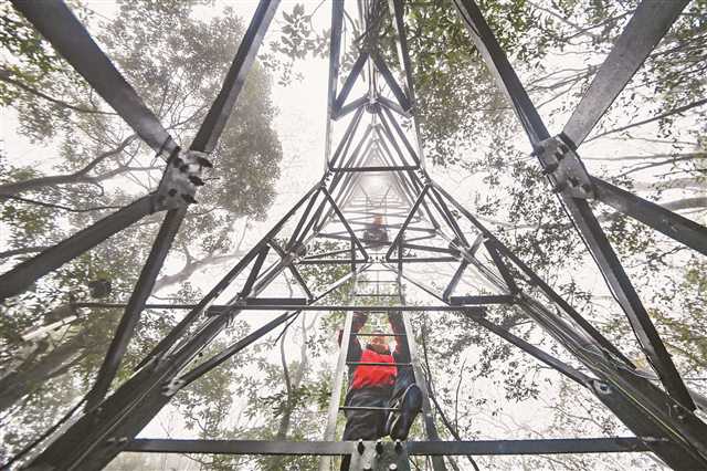 科研人员爬上次森林生态观测场的气象站铁塔采集数据。