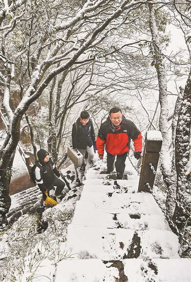 11月11日清晨,金佛山迎来今冬第一场雪。重庆日报记者随重庆金佛山喀斯特生态系统国家野外科学观测研究站(以下简称“金佛山国家野外站”),来到海拔约2200米的药池坝一带。
