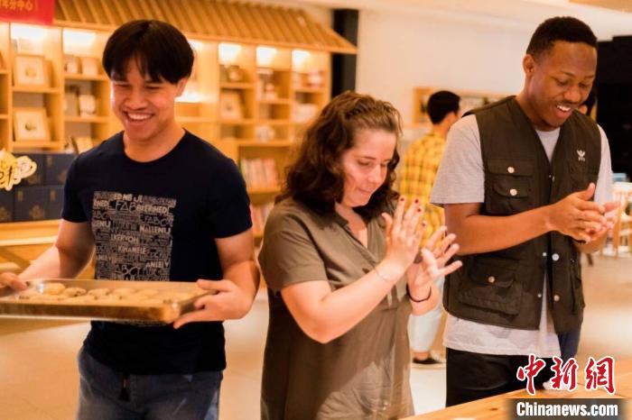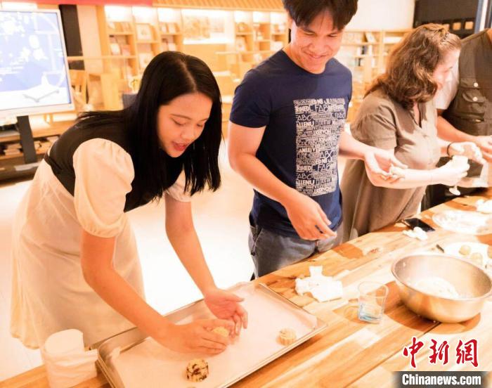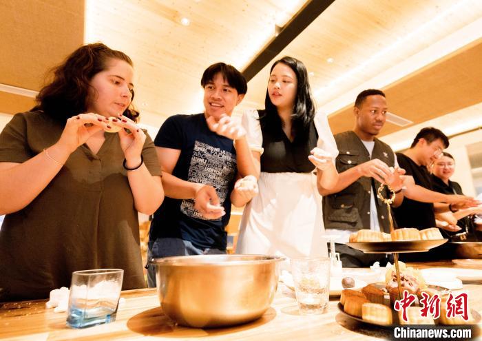 图为外国留学生探索月饼制作中和面的窍门。 黄维正 摄
