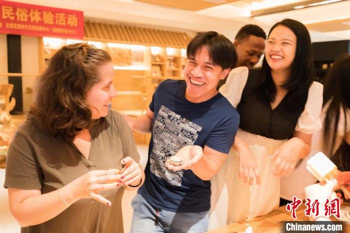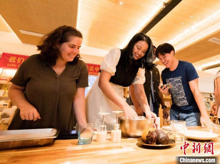 图为外国留学生相互交流制作月饼经验。 黄维正摄