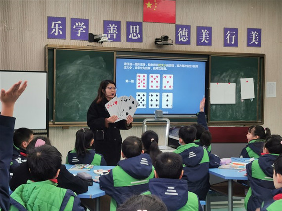 “这个知识点怎么讲,能让孩子们听得懂,理解得到?”“你先在十个圆里面,去掉一个,然后再加上5个,用上贴纸,帮助学生理解。”周雪梅老师正在为一位从教不久的年轻老师讲解教学方法,让她从学生的角度看待问题。而这样的教学探讨,对高新实验一小的数学教研组来说,已习以为常,与他们的教学息息相关。