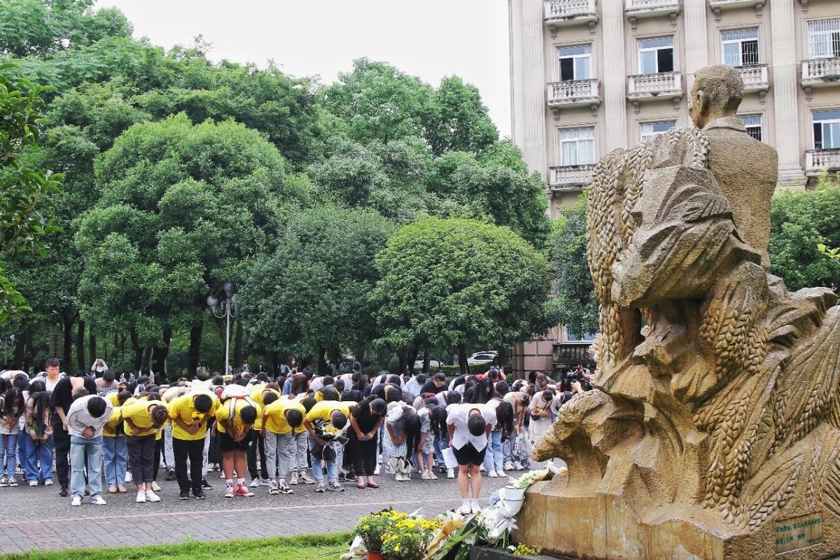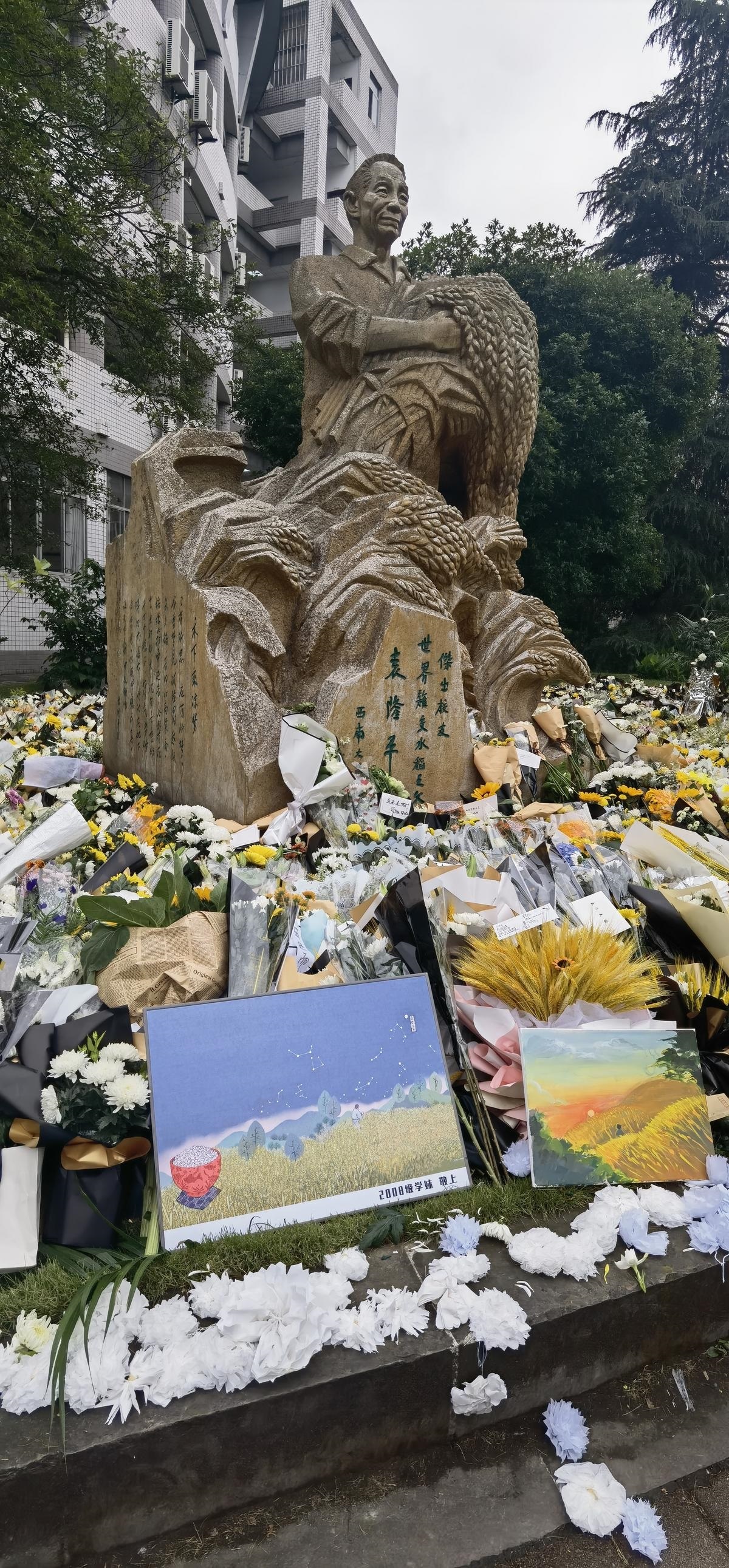 手握杂交水稻,双目远眺前方——32教学楼前,有一尊4米高的袁隆平雕像。雕像前的绿色草坪上,吊唁的花束已汇成一片花海。“禾下乘凉”,是betway88西汉姆联师生更是中华儿女共同追求的梦想。