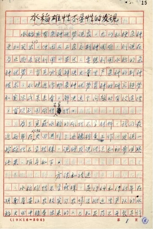 6年后,袁隆平发表第一篇论文《水稻的雄性不孕性》,刊登在中国科学院主编的《科学通报》半月刊第17卷第4期上。同年5月,国家科委九局局长赵石英看到后,以科委九局名义致函湖南省科委与安江农校,支持袁隆平的水稻雄性不育研究活动。