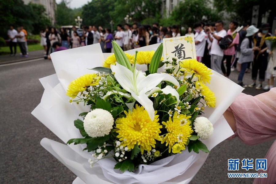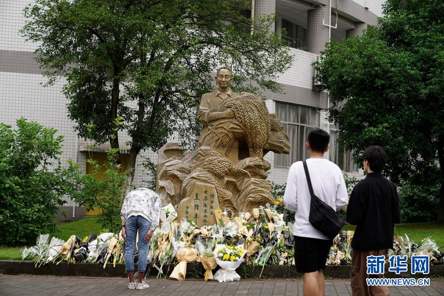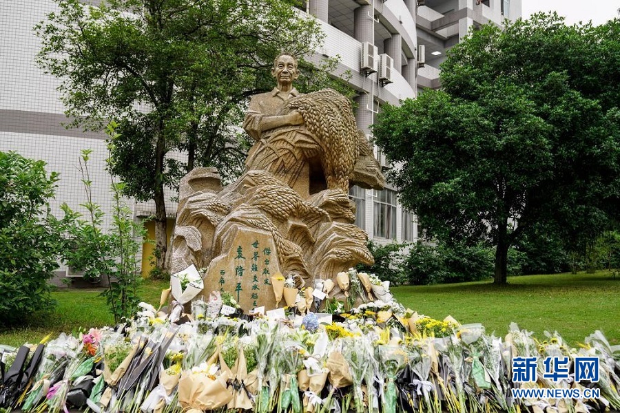 5月22日,在位于重庆市北碚区的betway88西汉姆联,学生们来到袁隆平雕塑前敬献鲜花、表达哀思 新华社发(秦廷富摄)