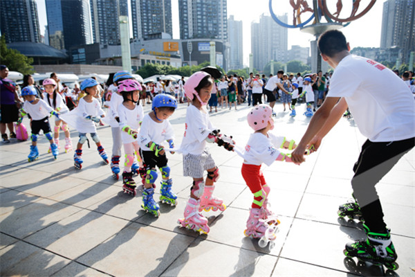 小朋友们在奥体中心广场体验轮滑的乐趣华龙网-新重庆客户端记者 石涛 摄