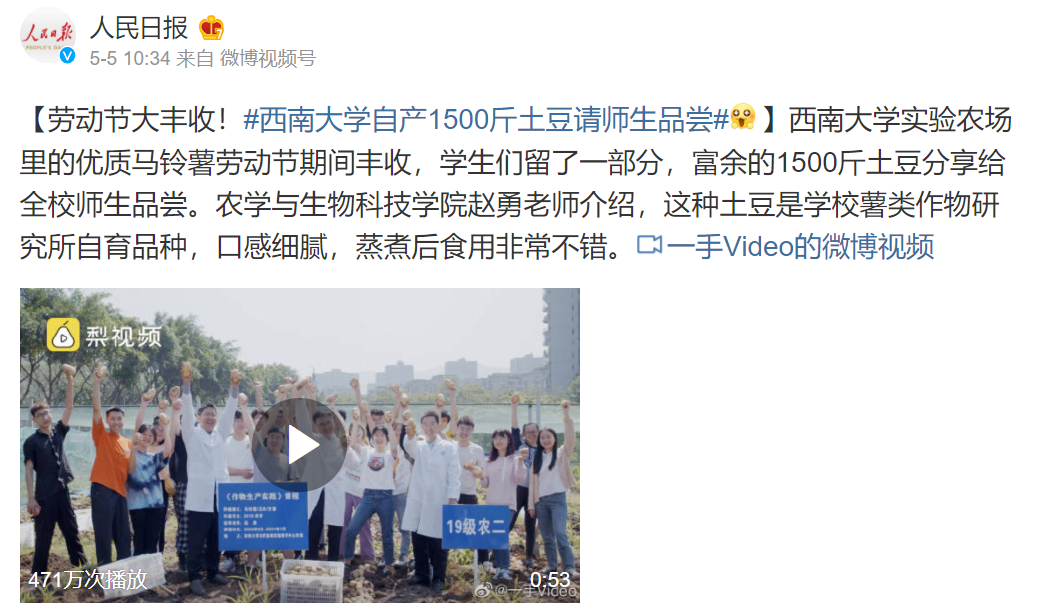 betway88西汉姆联实验农场里的优质马铃薯劳动节期间丰收,学生们留了一部分,富余的1500斤土豆分享给全校师生品尝。农学与生物科技学院赵勇老师介绍,这种土豆是学校薯类作物研究所自育品种,口感细腻,蒸煮后食用非常不错。