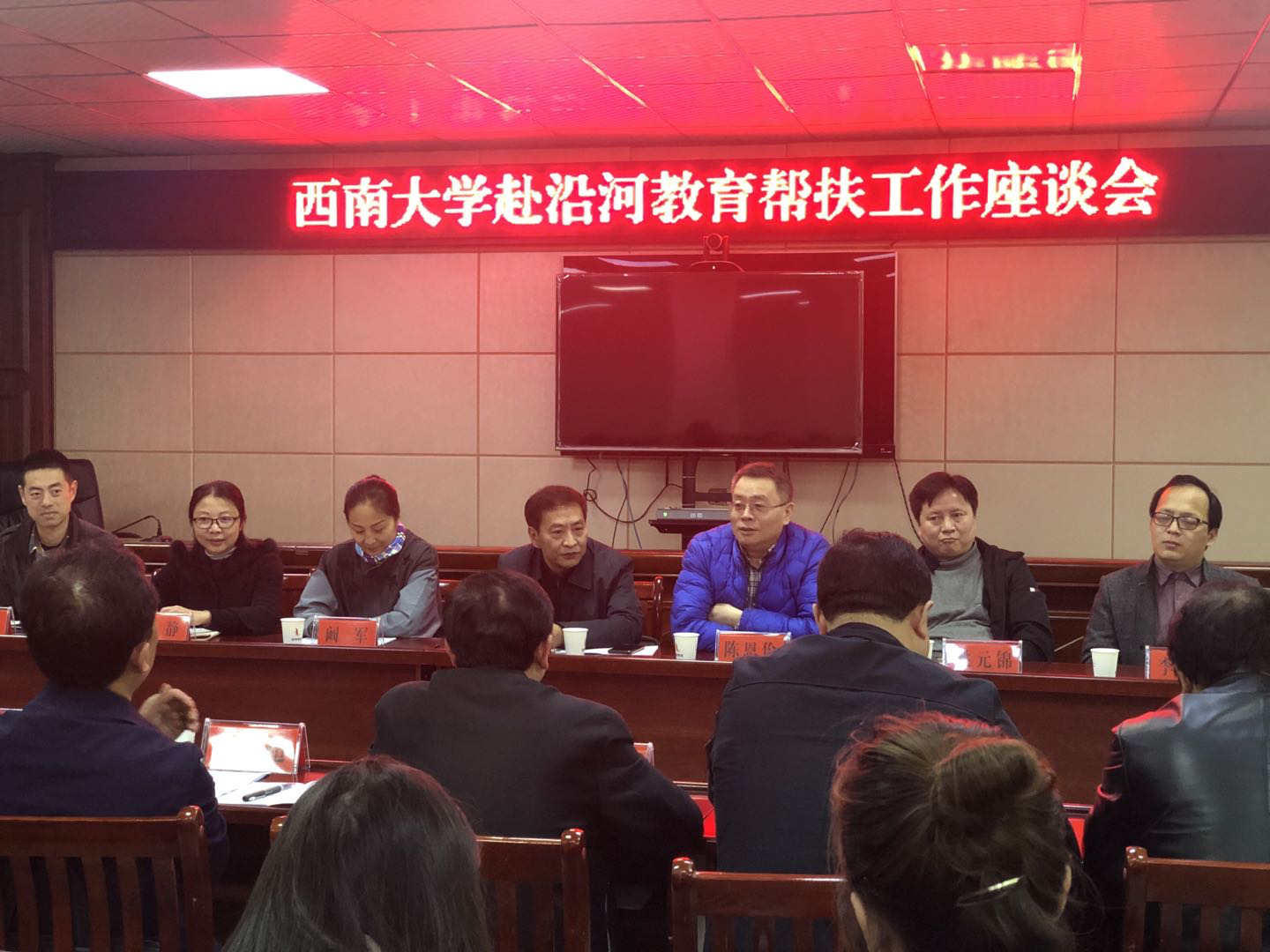参加座谈的有县委宣传部长杨超、县教育局局长杨树昌、二中校长冯林以及相关部门负责人。会议由黄剑副局长主持。杨局长介绍了整个沿河县的教育现状、存在问题,也同时提出了对教师教育学院教工二支部帮扶的期盼;二中冯校长介绍了二中的整体情况,包括校园条件、师资力量、学生升学情况等。同时冯校长也诚恳地告知了学校在发展中的主要问题和希望获得的支持。随后,陈恩伦院长代表教师教育学院教工二支部一行向与会人员介绍了教师教育学院的整体情况、职能定位,并明确对杨局长和冯校长提出的请求作出回应,包括通过我院优质教师继续教育平台,吸收沿河教师加入学科教师联盟,建立和学科名师之间的联系;为沿河教师提供继续教育的机会等。整个会议流淌着热烈、感动与温暖。