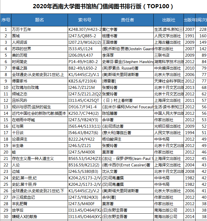今年,西大图书馆入围借阅量前十强的图书分别是:《万历十五年》(黄仁宇著),借阅228人次;《围城》(钱钟书著),借阅160人次;《人间词话》(王国维著),借阅149人次;《苏菲的世界》(挪威 乔斯坦·贾德 著),借阅142人次;《美的历程》(李泽厚 著),借阅89人次;《时间简史》(美国 史蒂芬 霍金),借阅84人次;《幸福之路》(英国 罗素著),借阅79人次;《全球通史(从史前到21世纪)》(美国 斯塔夫里 阿诺斯著)与《傅雷家书》(傅雷著)并列第9位,借阅均为77人次;第10名为《红玫瑰与白玫瑰》(张爱玲著),借阅68人次。