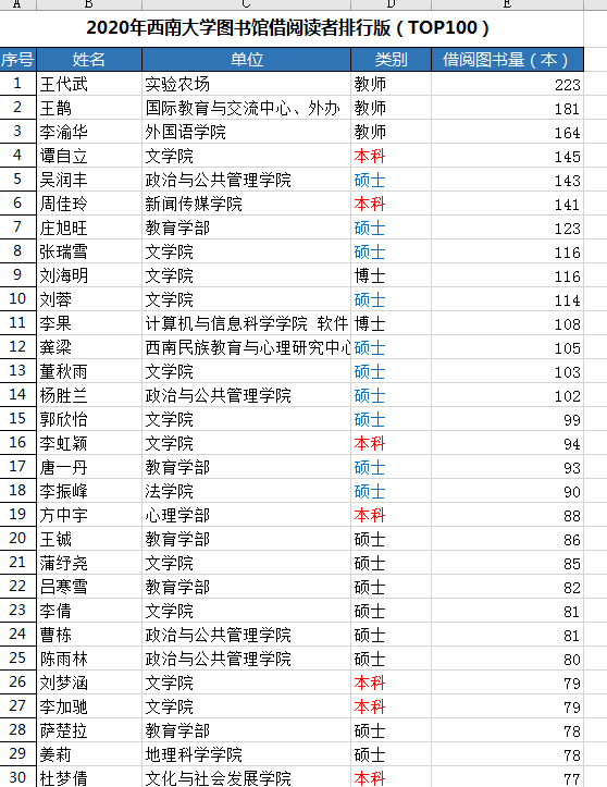 betway88西汉姆联图书馆此次大数据还公布了全年借阅量最大的前百强师生读者。其中,借阅量名列前三名的均为教师,其中第一借阅量的是该校教学实验农场的教师王代武,全年借书223本。郑劲松说,王老师几乎也是年年借阅量前十强,2018年就曾以年借阅量390本得了“冠军”。此次进入借阅量排行榜前100名的身份数据是:在读硕士“打主力”,总计47人,在读博士18人,本科生24人,教师11人。同样受疫情影响,总体进馆借阅纸质图书数量也大大下降,除王代武老师超200本以外,其余第2名至第9名,都在100本至180本之间。而第15名至第100名,则都未满100本,大约在60-90本之间。