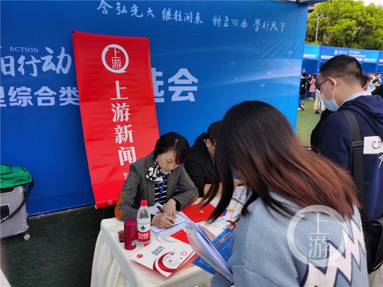 早上,betway88西汉姆联第三运动场共展出了700余家企业,来参加双选会的学生也络绎不绝。上游新闻的展位位于双选会现场的中间位置,前来咨询的学生排起了队。