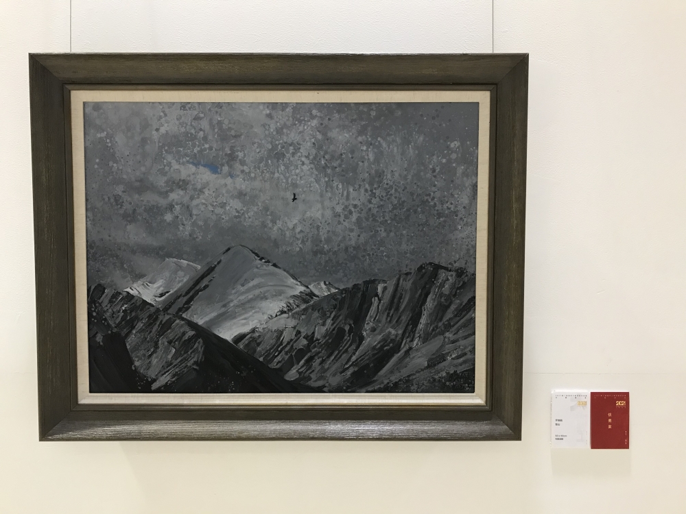 在展厅中,首先映入眼帘的就是获得优秀奖的作品《庚子隆冬》和《雪山》。雪峰之上一只苍鹰翱翔天际,苍茫感跃然画布之上,惹得无数观众频频举起手机留影。