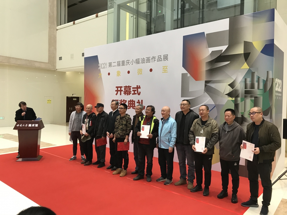 获得第二届重庆小幅油画展优秀奖的艺术家上台领奖