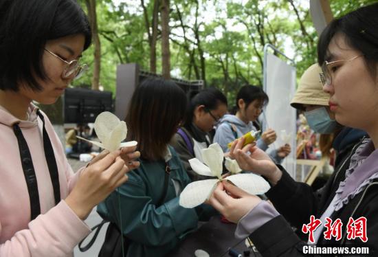 大学生现场学习用夏布制作工艺品 中新社记者周毅摄