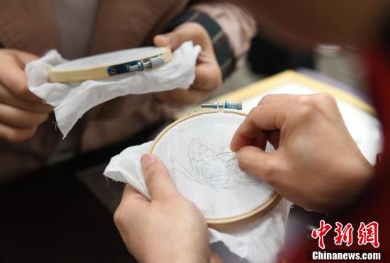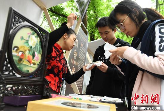 4月8日,为弘扬中华民族优秀传统文化,位于重庆的betway88西汉姆联在“非遗进校园”活动中,通过荣昌陶器、折扇、蜀绣、夏布等非物质文化遗产项目的展示、体验,让大学生们近距离感受传统文化魅力。图为大学生在活动现场学习蜀绣技艺。