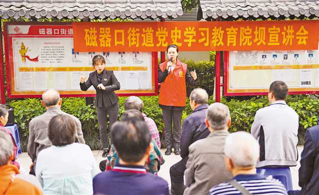 3月29日,在巴南区木洞镇二社区的一场党史学习教育中,国家级非物质文化遗产“木洞山歌”传承人喻良华将党史学习教育内容编入木洞山歌中,用悠扬的旋律、振奋人心的歌词,与在场群众一道“唱支山歌给党听”。