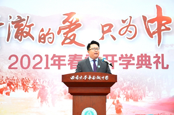 讲到动情之处,李校长还朗诵了国歌歌词选段,以此方式让全体师生思考,从小到大每次升国旗、唱国歌的时候,自己是不是真切明白国歌歌词的本真含义。他希望,西大华中的莘莘学子以校训“志远行笃、德厚才卓”为人生价值追求,做到发奋学习、可堪大任、敢于担当。