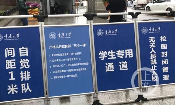 重庆大学保卫处安全防范科科长刘畅介绍,重庆大学今年返校时间是2月25日—27日一共三天,学校要求学生错峰返校,进入校门必须持有绿码、学生证和测体温。同时,学校将严格执行教育部“五个一律”要求,本学期学校将继续实行封闭式管理,除因公活动以外,一切无关人员与车辆均无法进入校园,请广大市民理解。