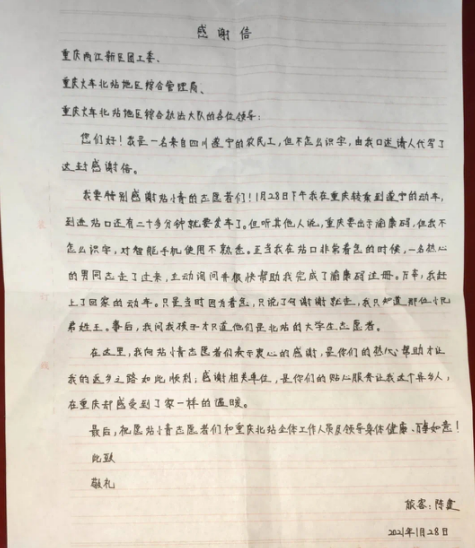 “我要特别感谢站小青志愿者们!是你们的热心帮助才让我的返乡之路如此顺利,是你们的贴心服务让我这个异乡人在重庆感受到家一样的温暖。”近日,重庆火车北站地区的春运志愿者“站小青”收到一封来自四川遂宁一农民工旅客陈建的感谢信。