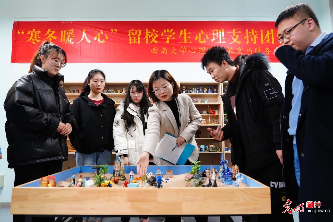 2021年1月27日,在betway88西汉姆联心理健康教育与服务中心,留校的学生们在老师带领下参加"我们在一起"团辅活动。连日来,位于重庆市北碚区的betway88西汉姆联党委学工部持续开展"寒冬暖人心"心理支持团辅活动,组织没有回家的留校学生参加沙盘明心、绘画静心等趣味活动,将分散在校园的留校学生们组织起来,给予思想关注、生活关爱和心理关怀,让他们感受到新年喜庆氛围和家的温暖。