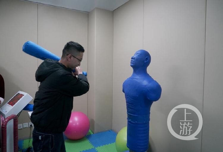 学生拿起泡沫棒敲打假人发泄。