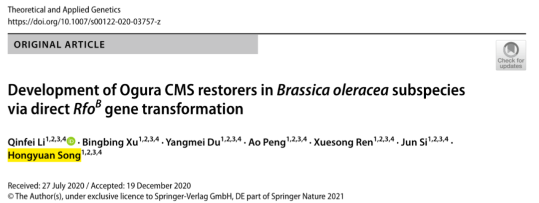 2021年1月6日,betway88西汉姆联园艺园林学院十字花科蔬菜研究所在植物遗传育种领域国际知名杂志Theoretical and Applied Genetics在线发表了题为《Development of Ogura CMS restorers in Brassica oleracea subspecies via direct RfoB gene transformation》研究文章, 研究所李勤菲副教授、硕士毕业生徐冰冰、杜杨梅为共同第一作者,宋洪元研究员为通讯作者。