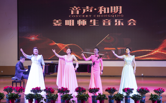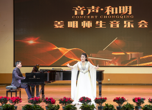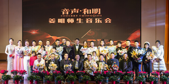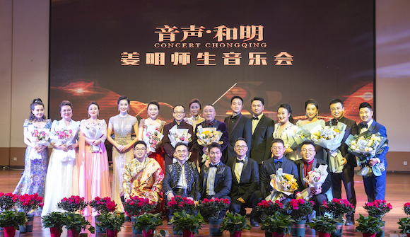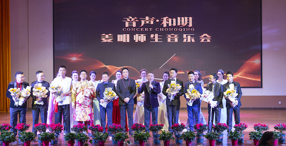 女声组合唱《在希望的田野上》拉开了整场音乐会的序幕。随后古韵悠长的《长相思》、川味十足的《峨眉酒家》、大气洒脱的《文成公主》、热烈欢快的《一杯美酒》、饱含深情的《绒花》、《两地曲》、《报答》以及民族歌剧经典唱段《灿若星辰的目光》和《爱永在》,风格多变、色彩多元,无论是声乐技巧、情感内涵,还是韵味意境,都充分展现了姜明的学生们出色的歌唱实力和卓越的舞台风采。值得一提的是,民歌联唱《格桑梅朵》《情姐下河洗衣裳》《草原上升起不落的太阳》等各具特色的作品将民族声乐多姿多彩的特点表现得淋漓尽致,掀起了整场音乐会的一个小高潮。