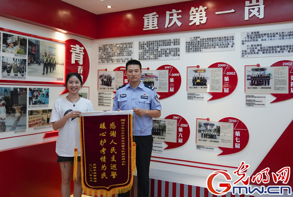 9月7日下午4点半,照片中受助女生18岁的婷婷(化名)拿着《录取通知书》、锦旗,和母亲一起专程走进渝中区交巡警解放碑大队。她要在踏入大学校园生活、开启人生新旅程之前,向曾无私帮助过她的所有警察叔叔们感恩,亲自说一声“谢谢。”