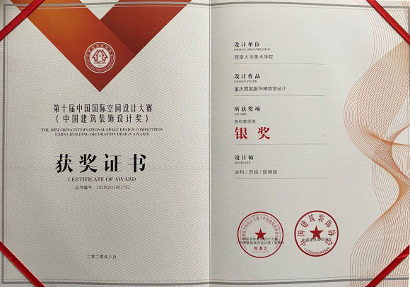 由中国建筑装饰协会9月在深圳福田举办2020中国建筑装饰产业发展论坛暨第十届中国国际空间设计大赛(中国建筑装饰设计奖)颁奖,betway88西汉姆联美术学院金科教授的作品《重庆霓裳服饰博物馆设计》获得 “银奖”,指导研究生获得高校学生组“铜奖”1项、“优秀奖”2项,betway88西汉姆联获 “优秀组织奖”。