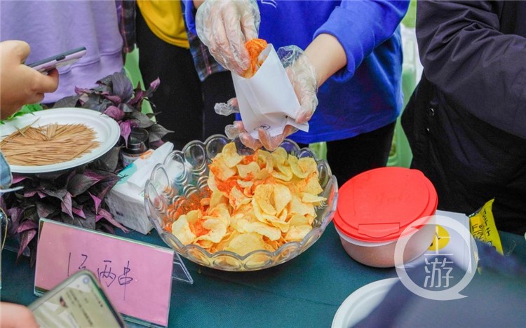 同学们品尝并购买西大“原创”薯片,津津有味地吃起来,农科院的张科同学说味道不错。