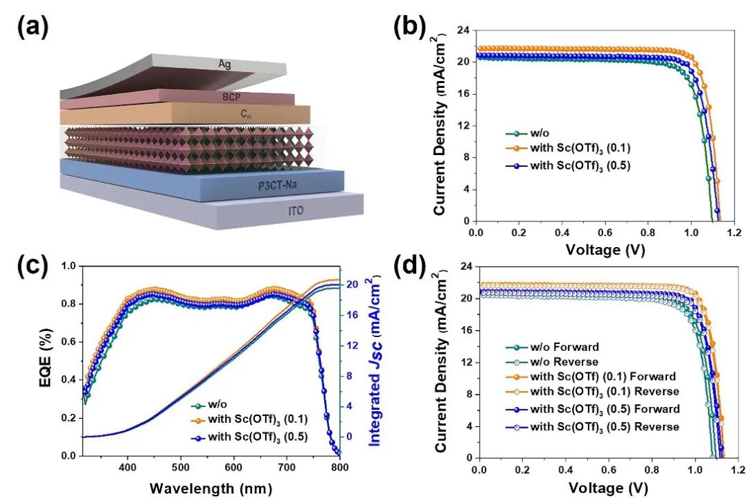 图二:(a)器件结构示意图;(b)不同浓度Sc(OTF)3掺杂器件的电流密度-电压(J-V)曲线;(c)外部量子效率(EQE)光谱和积分的Jsc曲线;(d)不同浓度Sc(OTF)3掺杂的器件的J-V迟滞曲线。