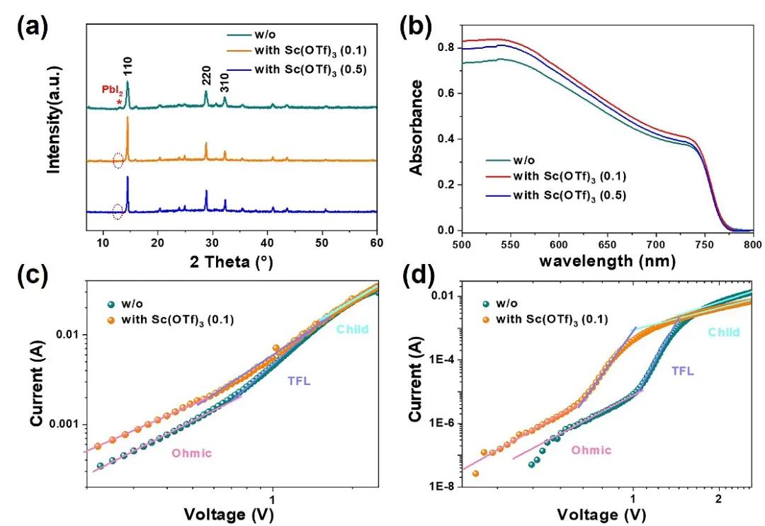 图一:不同浓度Sc(OTF)3掺杂钙钛矿薄膜的(a) XRD图谱,(b) UV-Vis吸收光谱;(c)仅空穴器件,(d)仅电子器件的原始钙钛矿和0.1mg / ml Sc(OTF)3掺杂钙钛矿的缺陷态密度曲线。