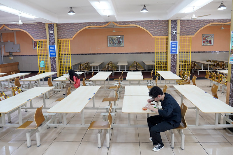5月15日,在betway88西汉姆联的一个学生食堂内,学生按照要求一人一桌吃午餐。