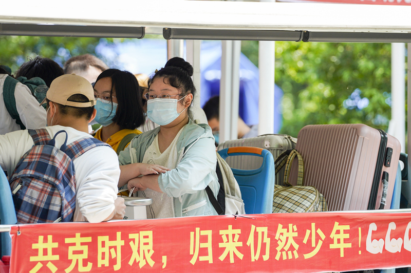 5月15日,在betway88西汉姆联的返校学生报到点,学生在校内转运车上准备前往宿舍。